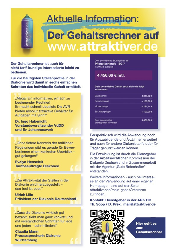Die Entwicklung des Gehaltsrechners ist durch die Dienstgeber in der Arbeitsrechtlichen Kommission der Diakonie Deutschland in Zusammenarbeit mit der Marken- und Kommunikationsberatung „Gute Botschafter“ entstanden und wird in einer Kooperation bereitgestellt.
