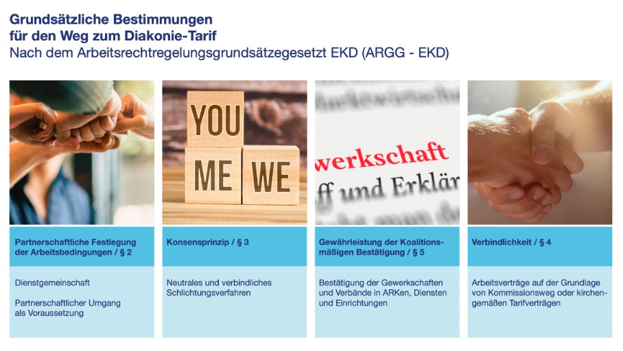 Es geht nicht allein um die Arbeit, sondern um das Miteinander der Menschen in allen diakonischen Berufen – wir nennen es seit je her „Dienst“. Den Ursprung hat es im Dienst am Nächsten und an der Nächsten, unmittelbar abgeleitet vom christlichen Gebot der Nächstenliebe. Deshalb sprechen wir nicht von Arbeitnehmer oder Arbeitgeberin, sondern von Dienstnehmer und Dienstgeberin. Daher sprechen wir auch von „Dienstgemeinschaft“. Der Unterschied zwischen Arbeit und Dienst wird so in der Sprache deutlich. Das Kommissions-Modell ist ur-demokratisch: Betroffene sollen als Beteiligte selbst für die Regelungen sorgen, die ihr Arbeitsverhältnis betreffen. Diakonie und Kirche geben einen Rahmen, in dem sich die Sozialpartner verantwortlich, demokratisch und thematisch streiten.