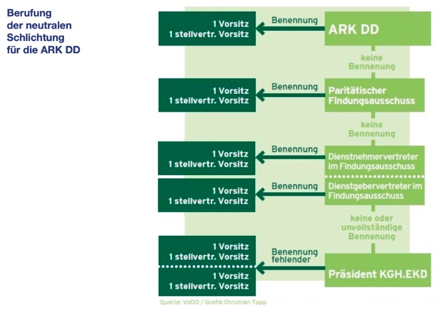 Gelingt in zwei Abstimmungen zum gleichen Thema keine Einigung, kommt es zur ersten Stufe der Schlichtung: Gemeinsam mit dem Schlichtungsvorsitz wird ein intelligenter Kompromiss gesucht, der anschließend vereinbart oder in der Kommission beraten wird. Für den Fall, dass auch auf diesem Weg des Vermittlungsversuchs keine Lösung gefunden wird, entscheidet die Schlichtung in einer zweiten Stufe mit Stimmenmehrheit erneut. Dabei hat der Schlichtungsvorsitz ebenfalls Stimmrecht. Der Schlichtungsvorsitz wird nach festen Regeln von beiden Seiten gemeinsam bestimmt und hat in der zweiten Stufe dann auch durch das Stimmrecht die entscheidende Rolle. Die Schlichtung entscheidet auf diese Weise verbindlich und abschließend.