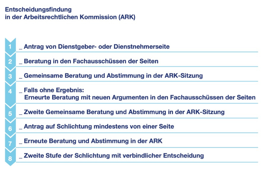 Wenn es um die Weiterentwicklung der Tarife zum Beispiel zu Gehaltssteigerungen oder Zuschlägen geht, wird strittig diskutiert – und dann abgestimmt. Die Abstimmung ist Ausdruck gelebter Demokratie, da alle Betroffenen mitwirken können. Zudem ist sie paritätisch, denn Dienstnehmer und Dienstgeber haben die gleiche Stimmenzahl. Für die Weiterentwicklung des Tarifs muss eine qualifizierte Mehrheit gefunden werden. Eine einfache Mehrheit reicht für Veränderungen nicht aus, denn diese sollen überzeugend und nachhaltig sein.